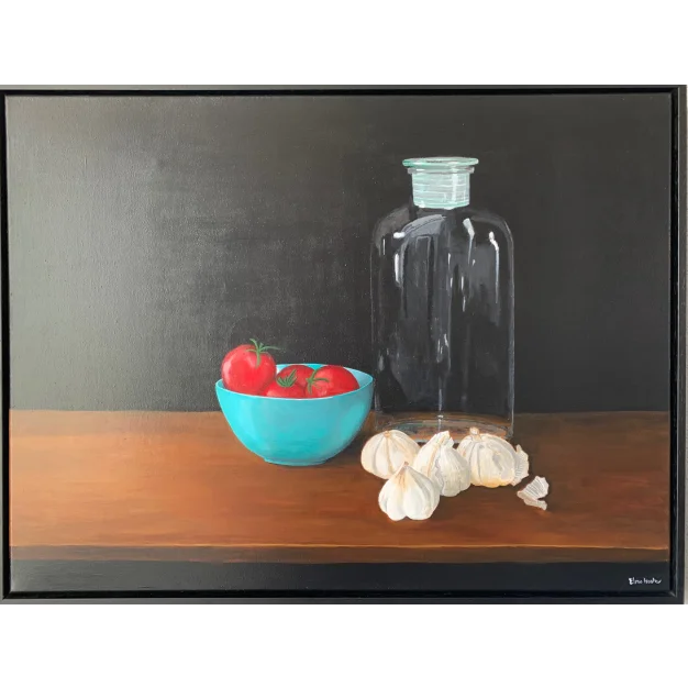 Still life with glass bottle, a bowl of tomatoes and garlic on a wooden table